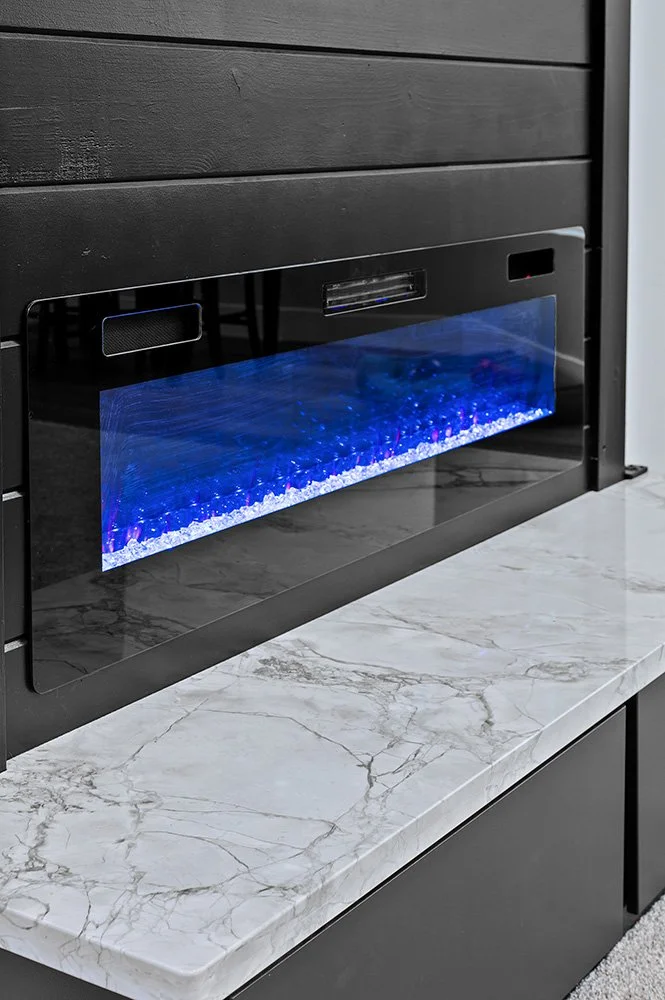 The living area got its share of love too, with Super White Polished Marble adorning the fireplace hearth. This simple yet stunning addition creates a cozy, inviting space for family and friends to gather.